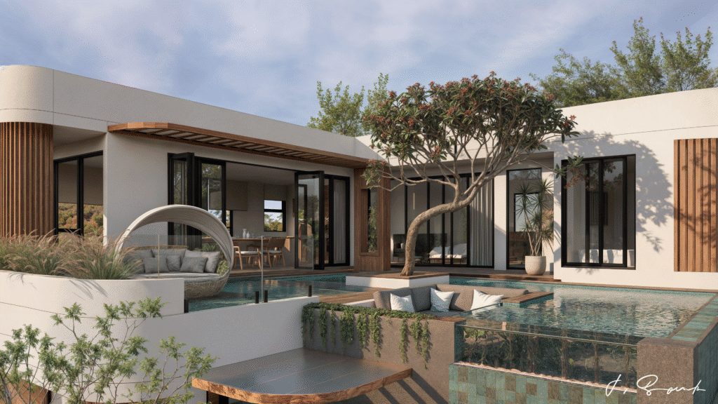Chaque villa est dotée d’une piscine privée et entièrement meublée.